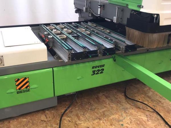 il centro di lavoro Biesse Rover 322 è un pantografo a controllo numerico per la lavorazione in legno di prima generazione, con tutto il necessario indispensabile per la lavorazione del legno in una falegnameria.
