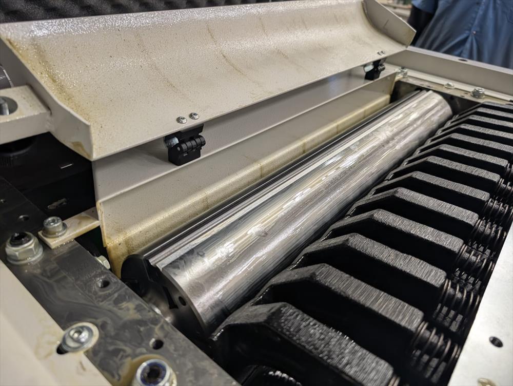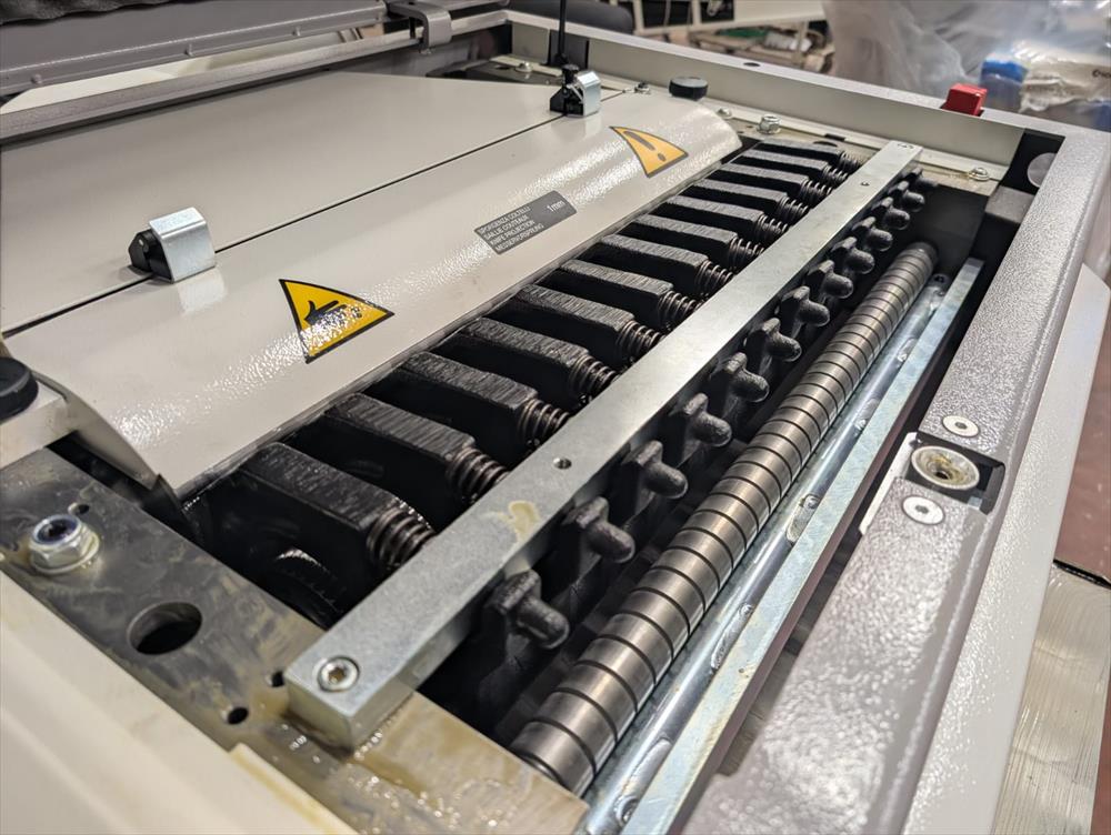 La macchina è dotata di un piano in ghisa fortemente nervata che scorre verticalmente su quattro viti in acciaio, con sollevamento motorizzato a due velocità e avanzamento micrometrico. L’albero pialla a quattro coltelli garantisce finiture di altissima qualità, mentre i rulli di trascinamento – uno rigato in acciaio all’ingresso e uno gommato in uscita – assicurano un perfetto avanzamento del pezzo.
